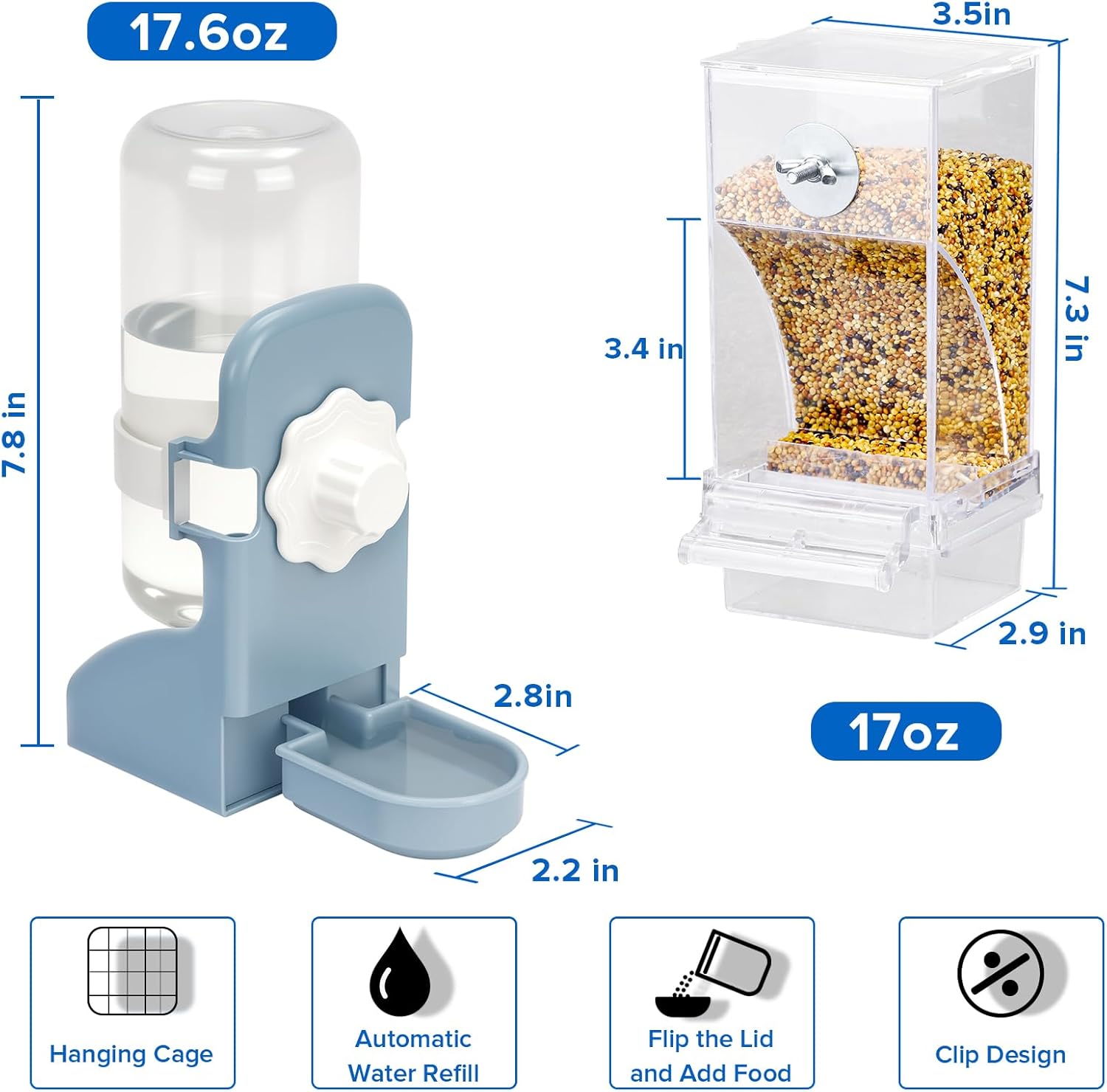 A bird feeder and waterer set suitable for small and medium birds. When your bird eats, seed shells and uneaten seeds will remain in the slot compartment below, keeping the bird cage or room clean, and the bottom independent drawer design is easy to remove. This automatic bird feeder and water dispenser in the cage adopts a gravity automatic feeding design, which does not need to replenish food and water every day, saving your time and energy, and the transparent structure can easily and quickly view the remaining food and water level, which is convenient for timely addition.