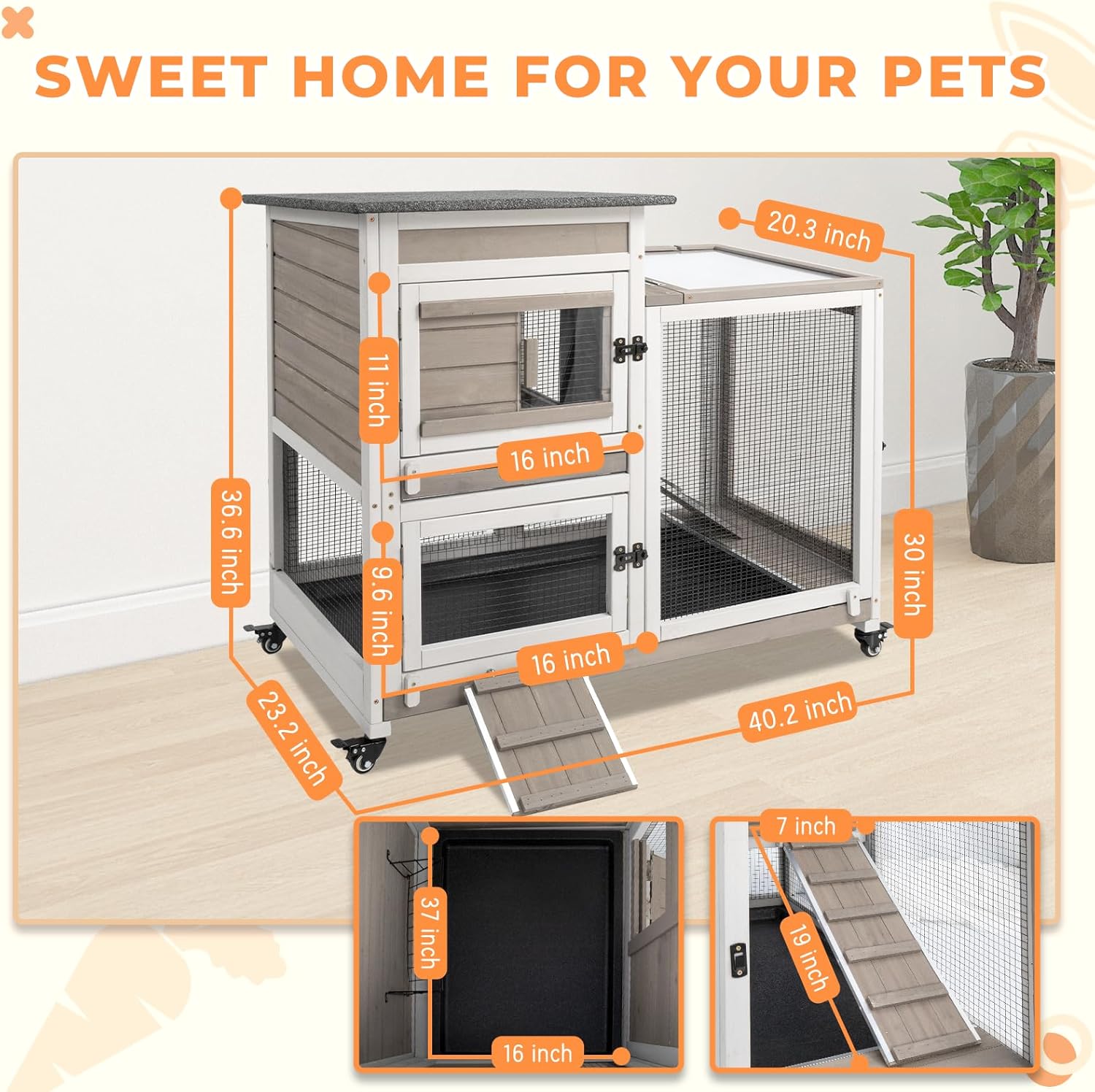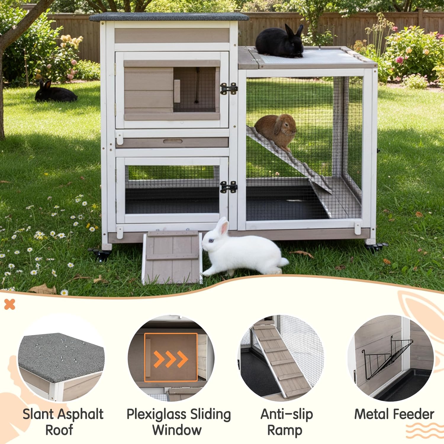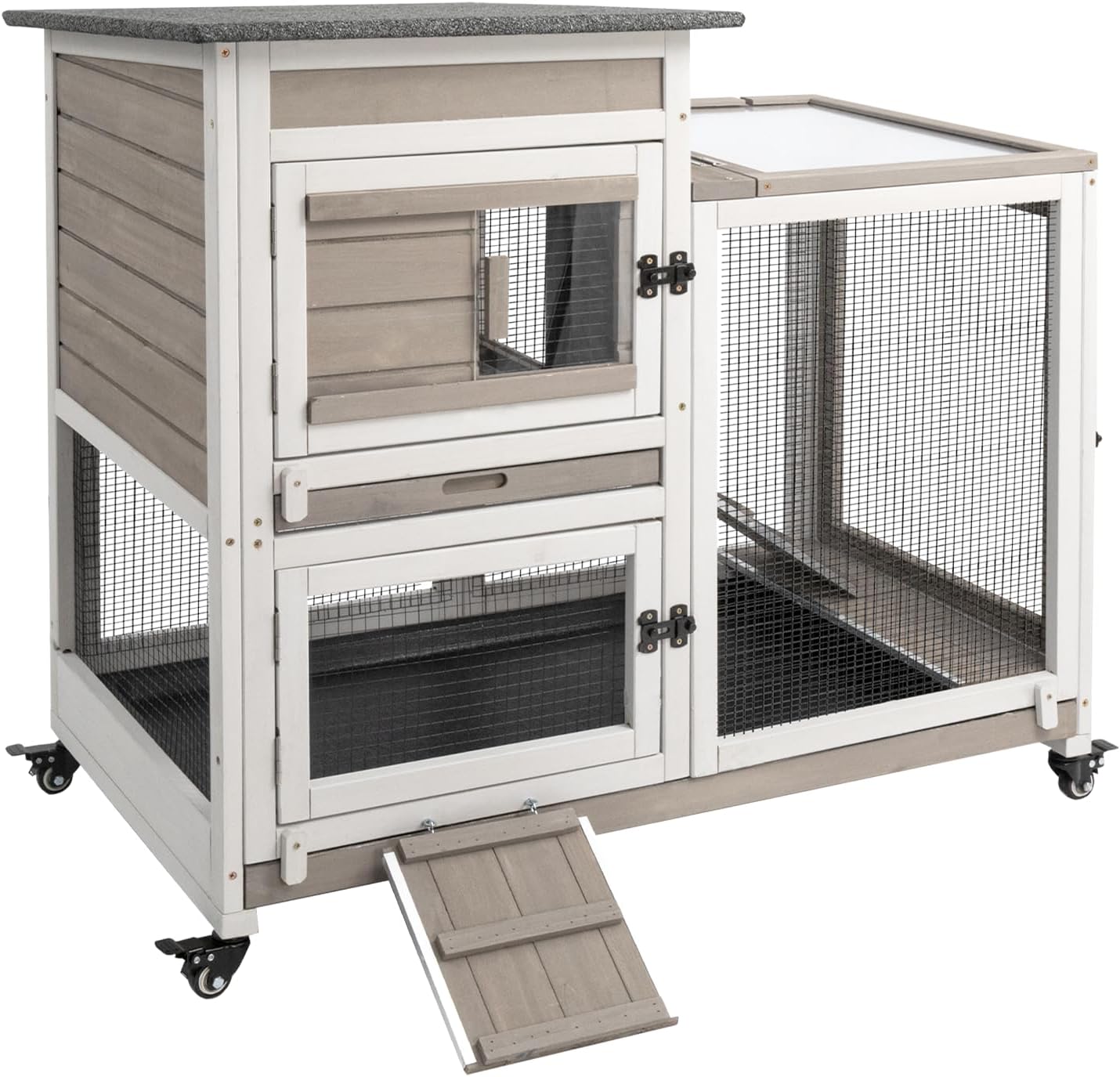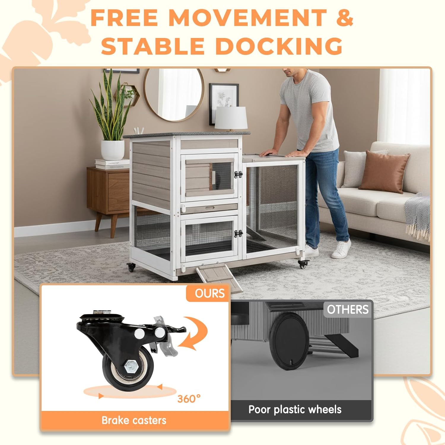 Mobile bunny Hutch This indoor rabbit hutch comes with four flexible wheels for easy movement. You can reposition it anywhere you like, and the secure locking mechanism keeps it firmly in place.