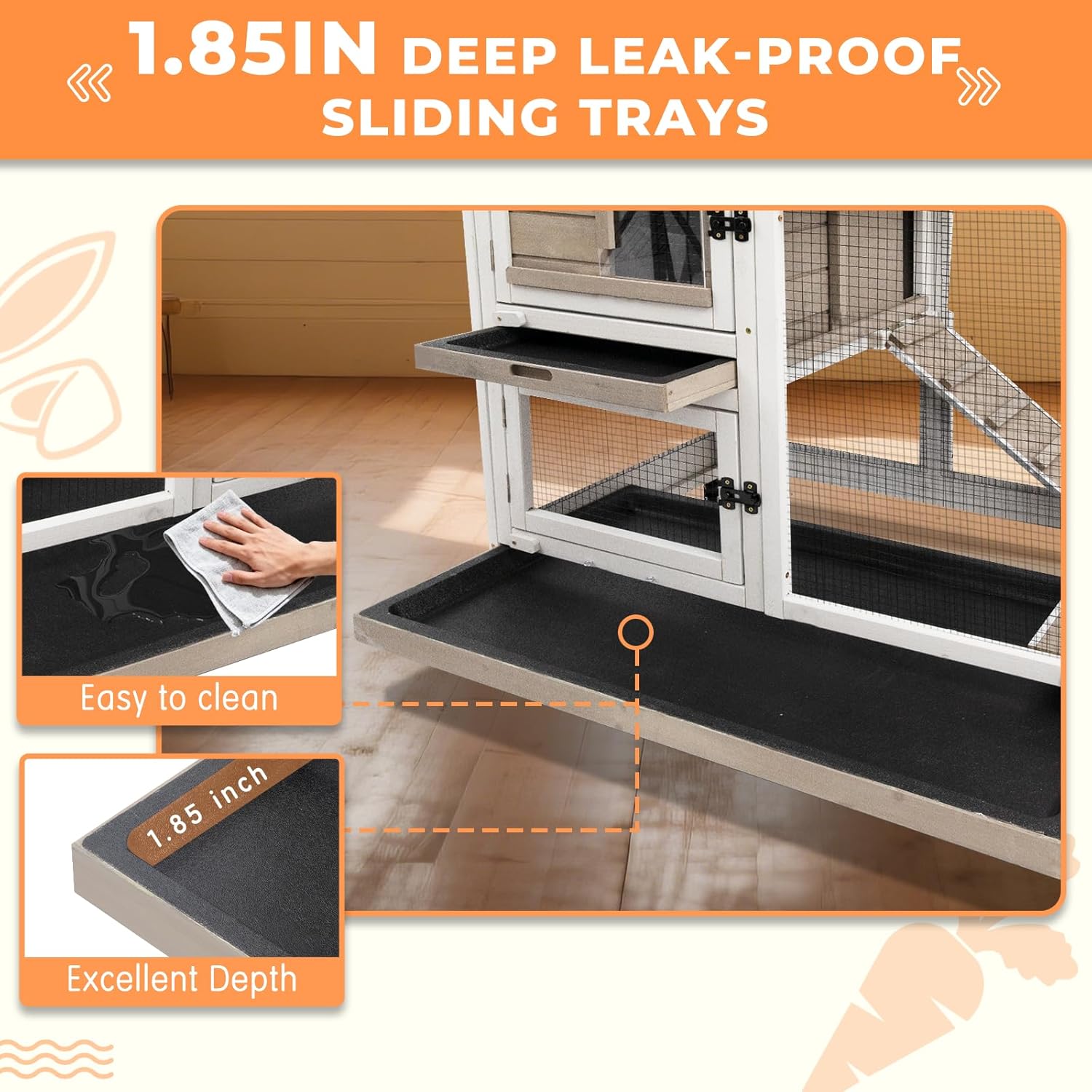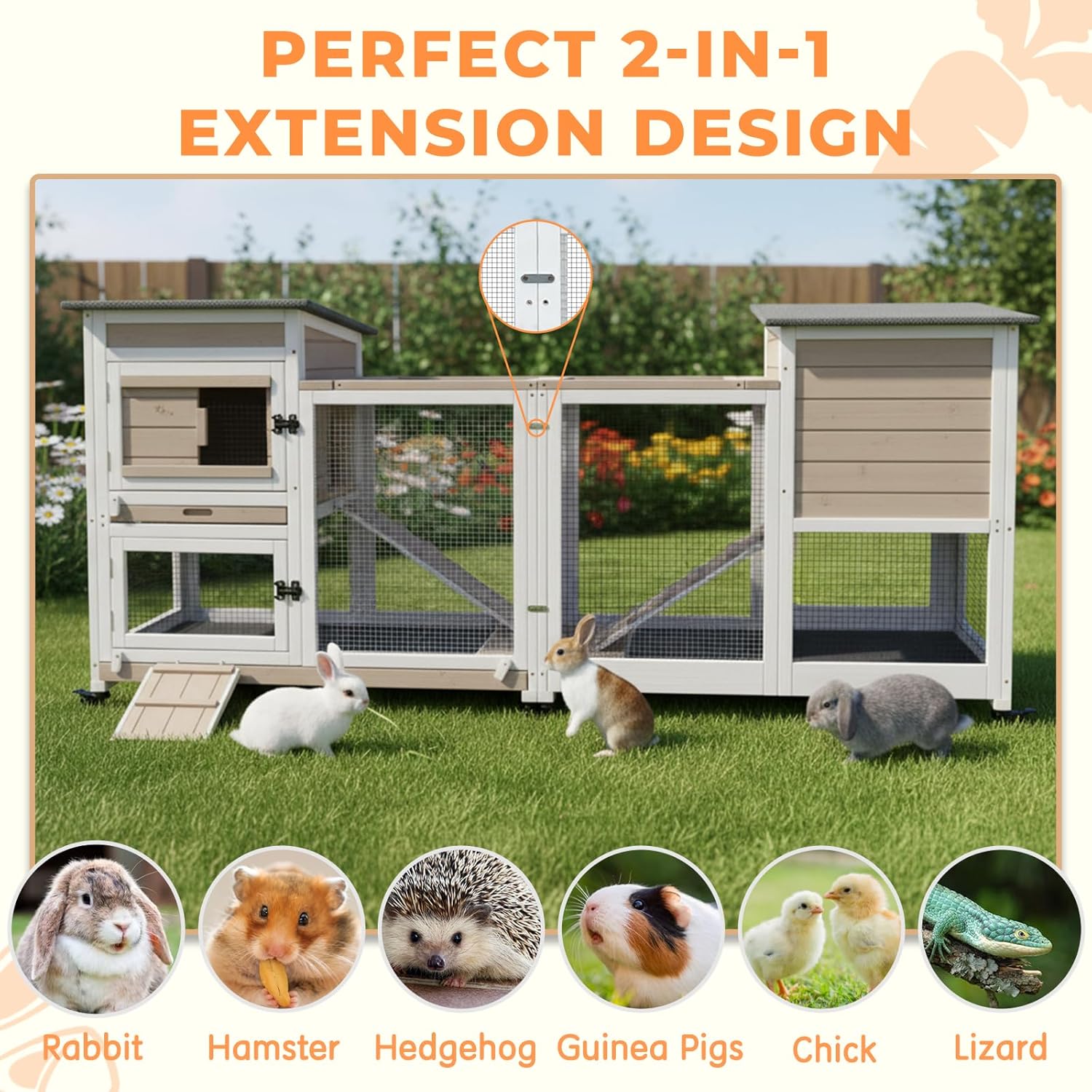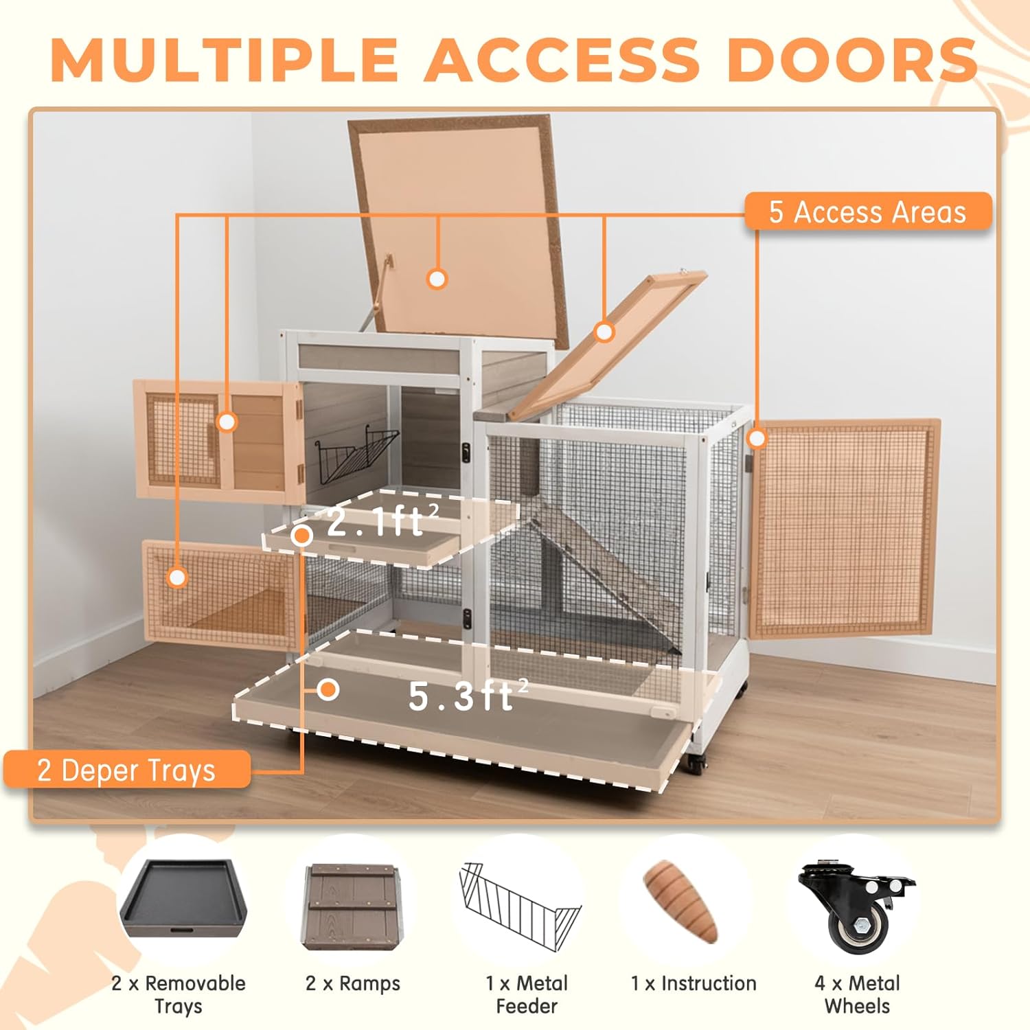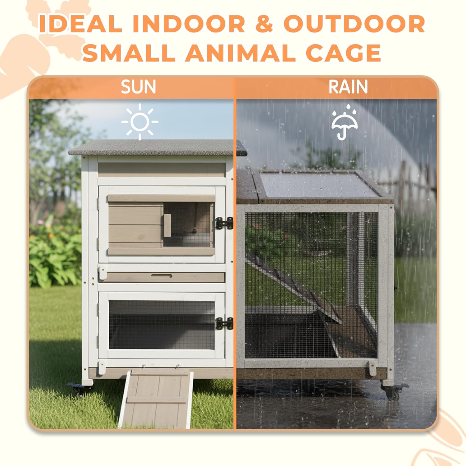 Mobile bunny Hutch This indoor rabbit hutch comes with four flexible wheels for easy movement. You can reposition it anywhere you like, and the secure locking mechanism keeps it firmly in place.