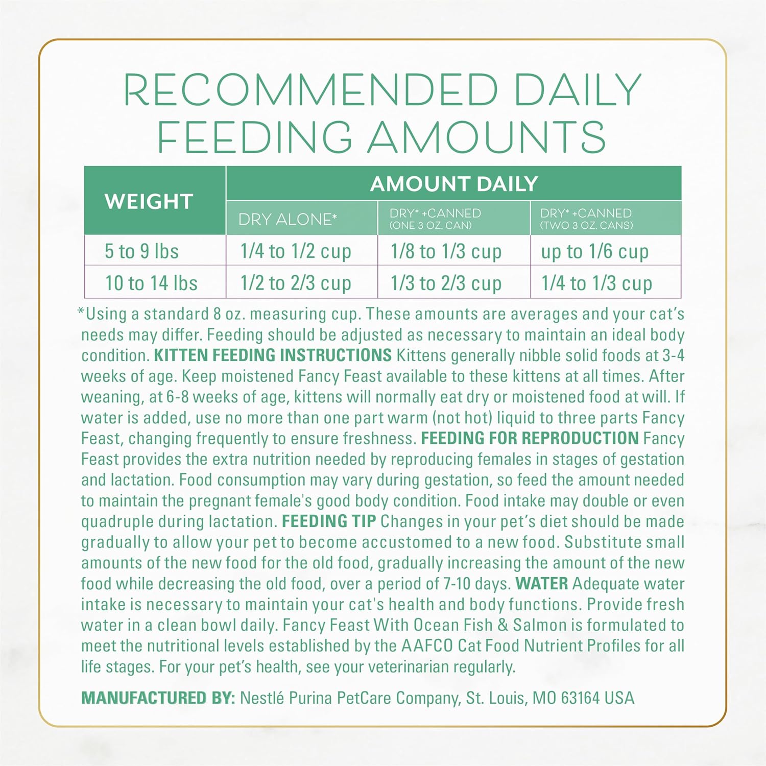 Delight your cat every day with a dish of Purina Fancy Feast Dry Cat Food With Ocean Fish and Salmon and Accents of Garden Greens, and feed her nutritional needs along with her desire for delicious taste and satisfying textures. Multiple shapes draw her to her bowl, and the colorful variety keeps her there. She can dig into the crunchy texture that cats crave while enjoying delicious flavors they adore. Your cat’s getting 100 percent complete and balanced nutrition for adult cats in a high-quality cat dry food you can feel good about giving her. Made with a variety of seafood and accents of garden greens, this premium Purina dry cat food offers a gourmet taste that’s formulated just for cats–taking dry cat food to the next level. Satisfy your feline friend’s need for deliciousness while also providing essential vitamins and minerals to help support her health by filling her bowl with this Purina Fancy Feast Dry Cat Food With Ocean Fish and Salmon and Accents of Garden Greens.