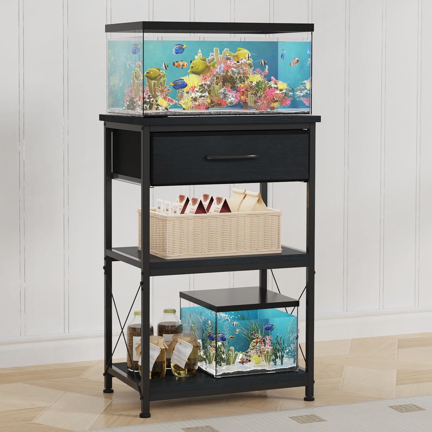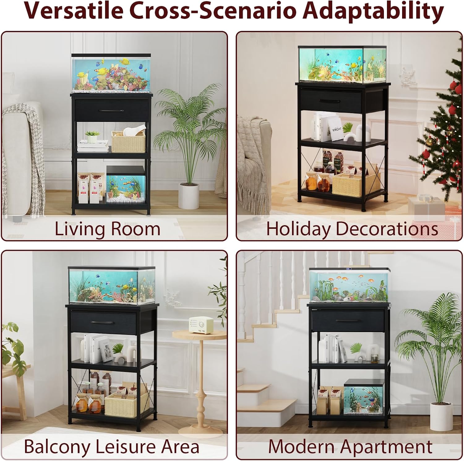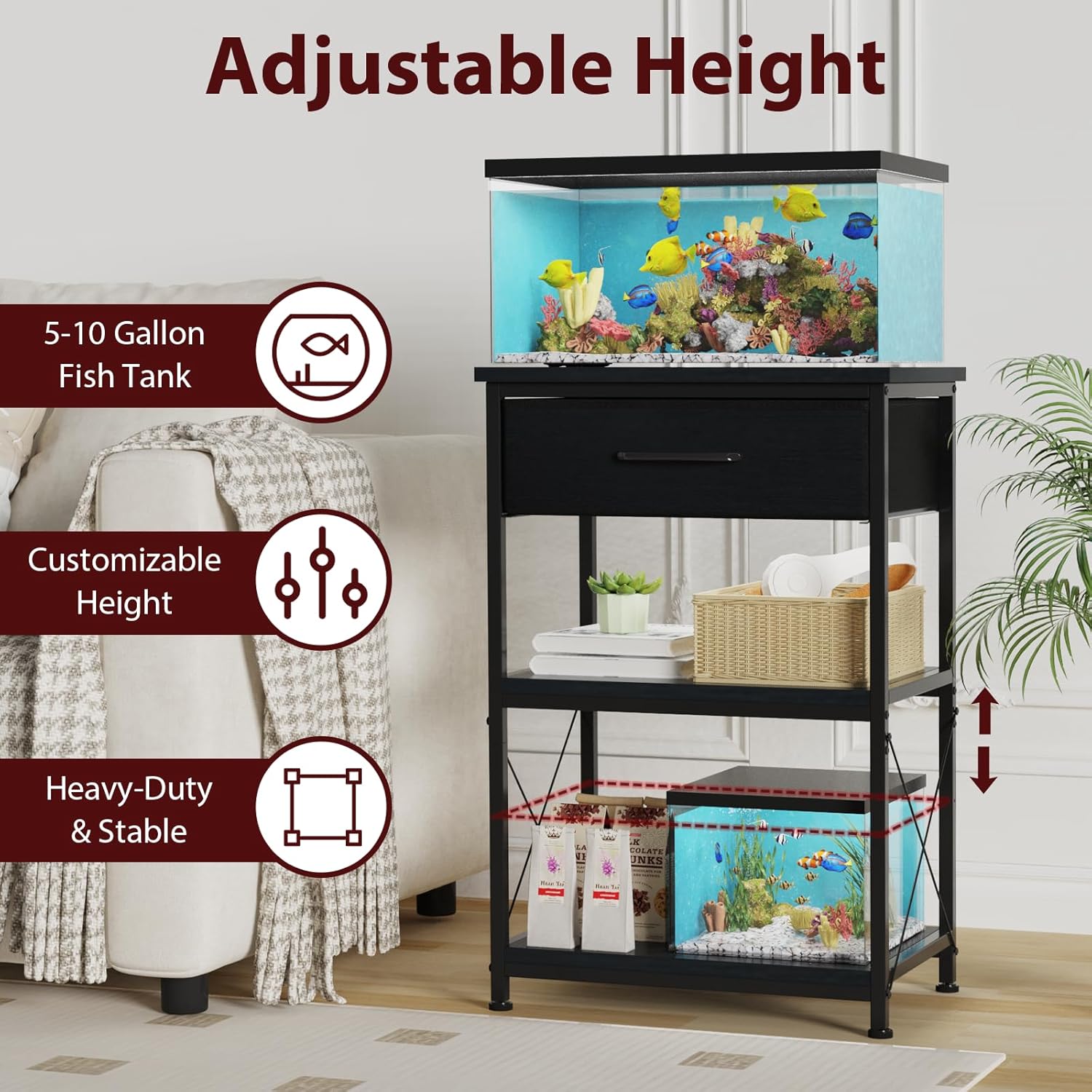 This fish tank stand is engineered for maximum utility. The top tier securely holds a 5-10 gallon tank, while the versatile bottom shelf can accommodate a second small aquarium of any shape or serve as a spacious and practical storage space. Height Adjustable Metal Aquarium Stand with Storage Drawers for Fish Tank Accessories Storage, Perfect for Turtle Tank, Reptile Terrarium, Black