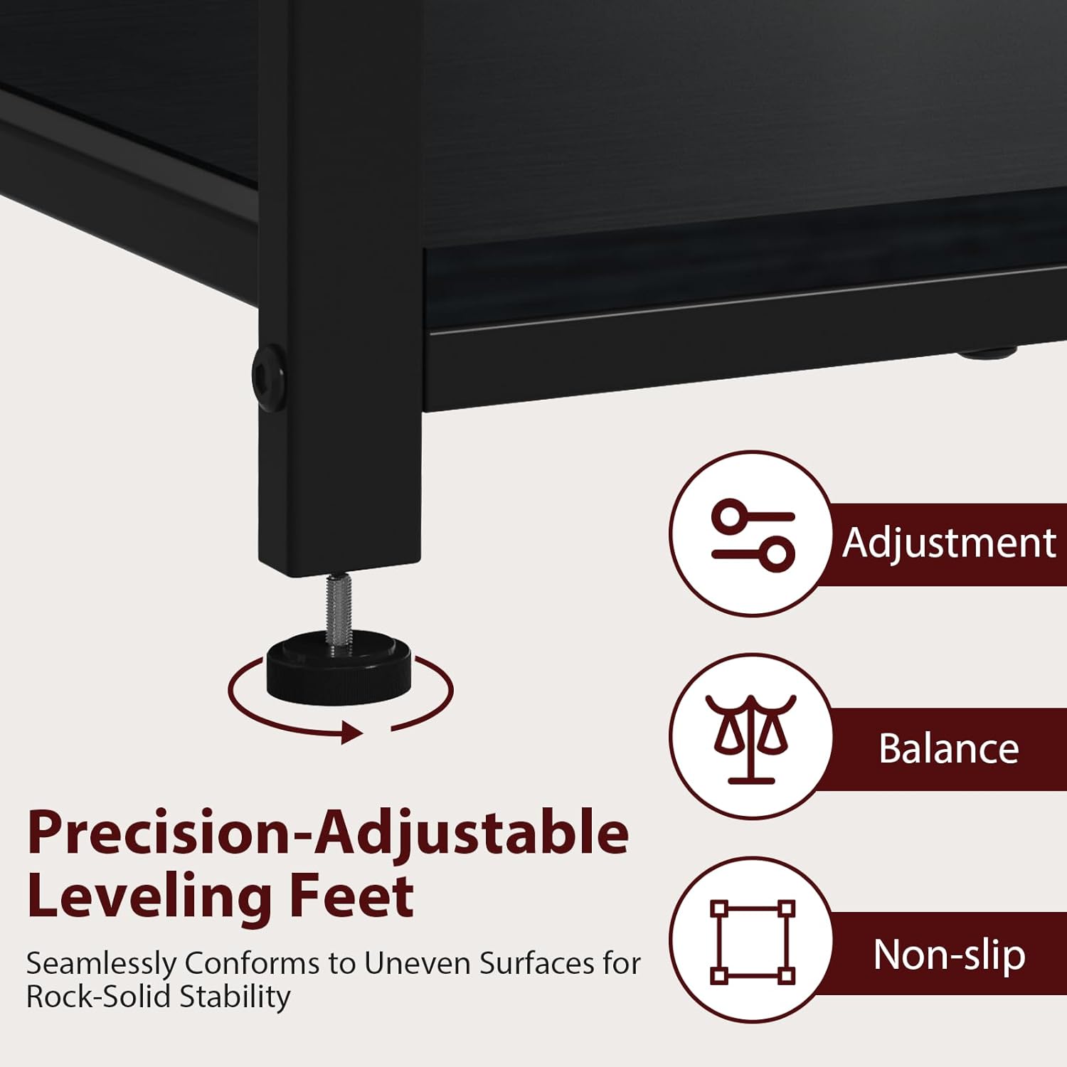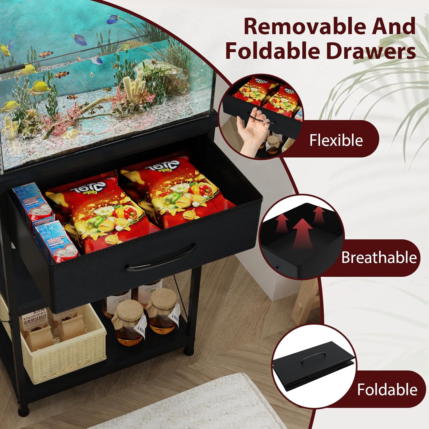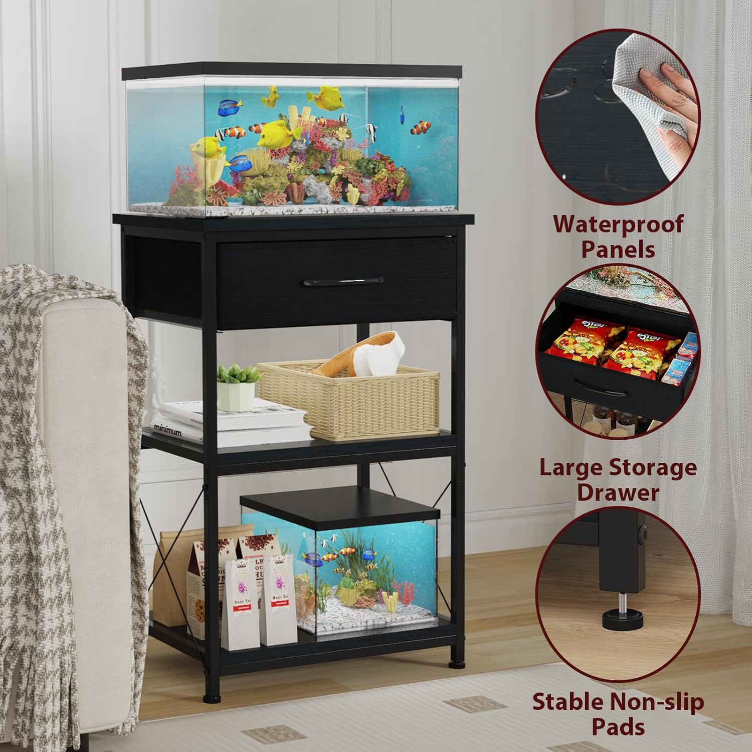 This fish tank stand is engineered for maximum utility. The top tier securely holds a 5-10 gallon tank, while the versatile bottom shelf can accommodate a second small aquarium of any shape or serve as a spacious and practical storage space. Height Adjustable Metal Aquarium Stand with Storage Drawers for Fish Tank Accessories Storage, Perfect for Turtle Tank, Reptile Terrarium, Black