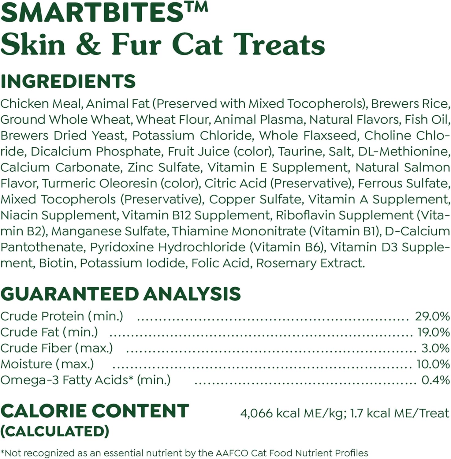 Feline Greenies Smartbites Skin & Fur Treats for Cats are the perfect treat to keep your cat purring. Designed by veterinarians with fish oil that provides a rich, natural source of omega-3 fatty acids, as well as ground flaxseed, these healthy cat treats help maintain healthy skin and fur. These greenies cat treat are a delicious vet recommended cat snacks that have added vitamins, minerals, and other nutrients for a nutritionally complete and balanced snack. Plus, the irresistible little treats come in a delectable salmon flavor and have a delightful crunchy and soft dual-texture. These Feline Greenies are tasty skin and fur treats your adult cat will love. They’re also the perfect sized treats for cat toys… try placing a few inside a treat dispenser toy and watch your cat chase and swat away. Share with all the Felines in your life and give them Feline Greenies Smartbites Skin & Fur Treats for healthy, happy purrs of joy. 2.1 ounce pack