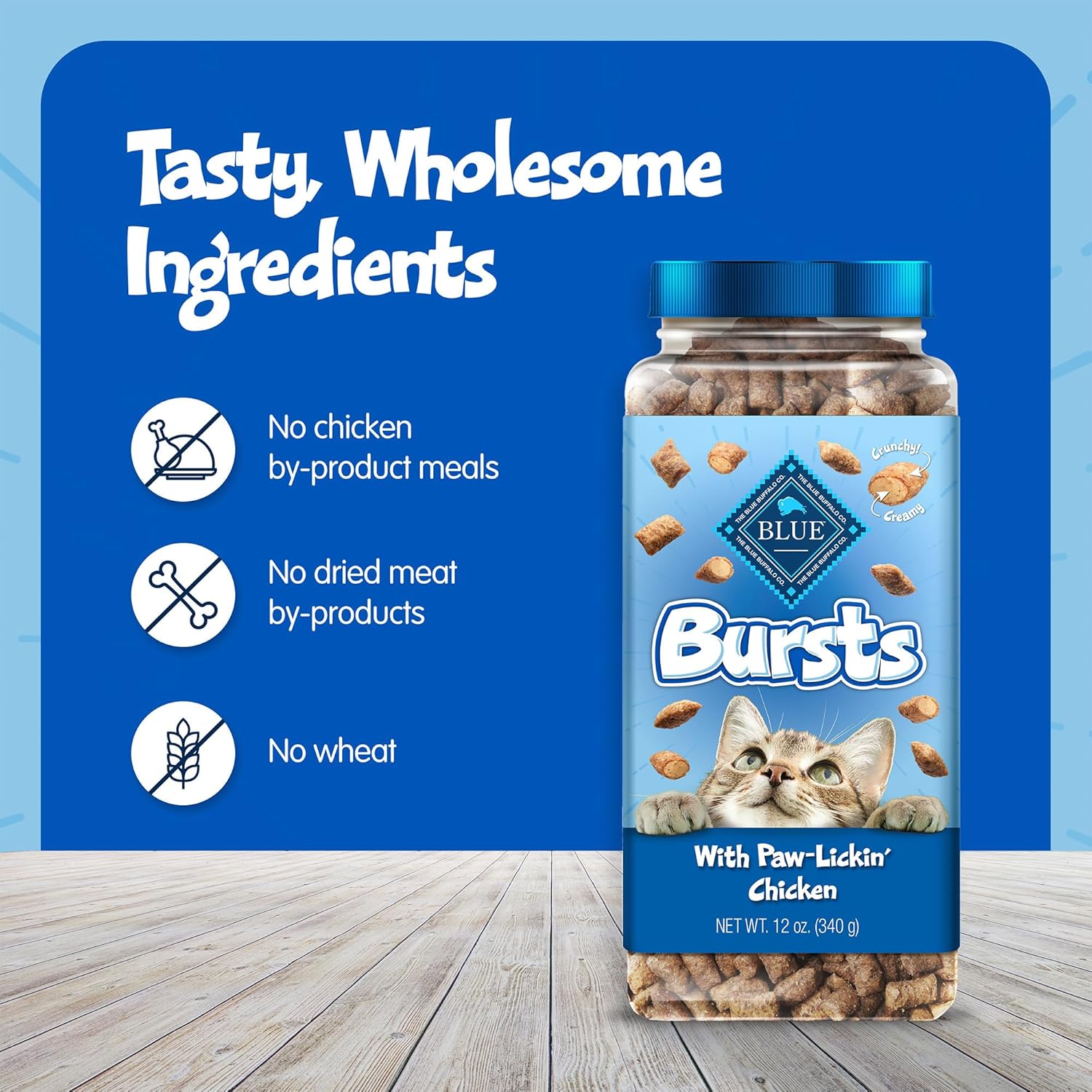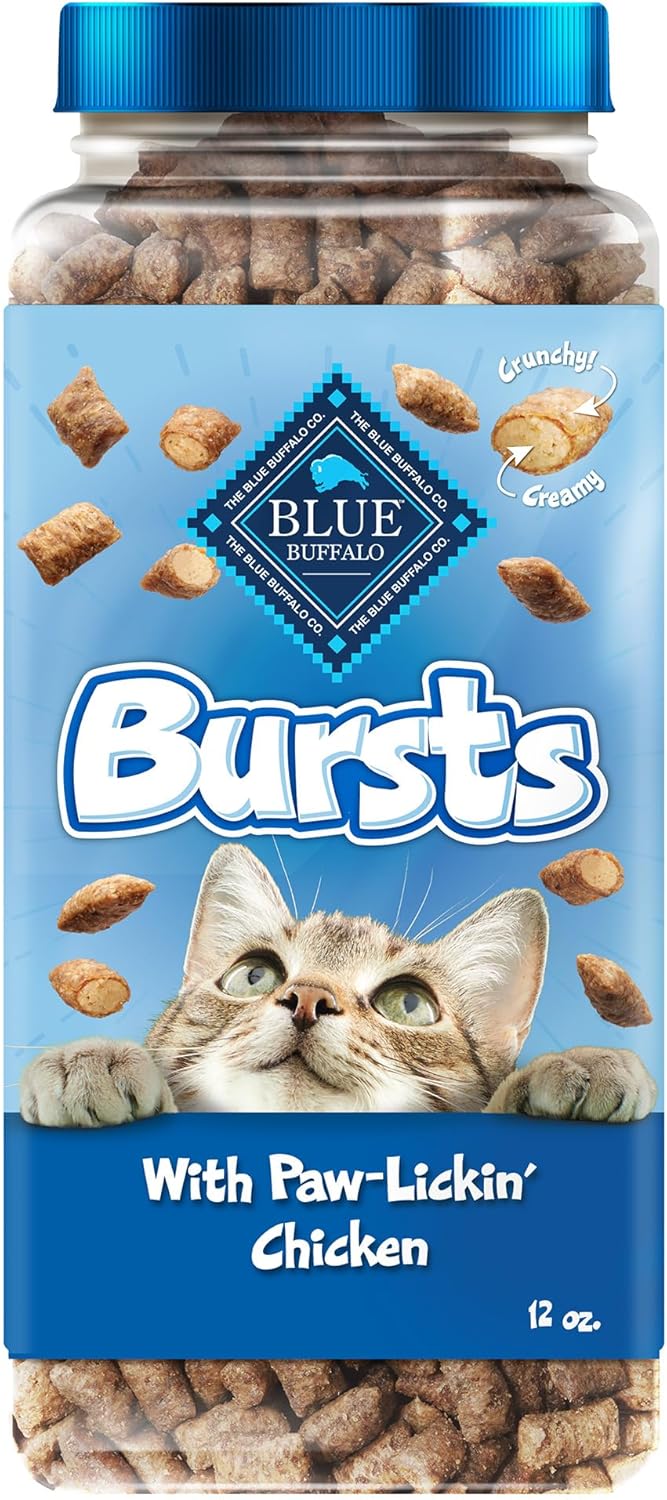 - Contains One (1) 12-oz tub of BLUE Bursts Crunchy & Creamy Cat Treats with Paw-Lickin’ Chicken