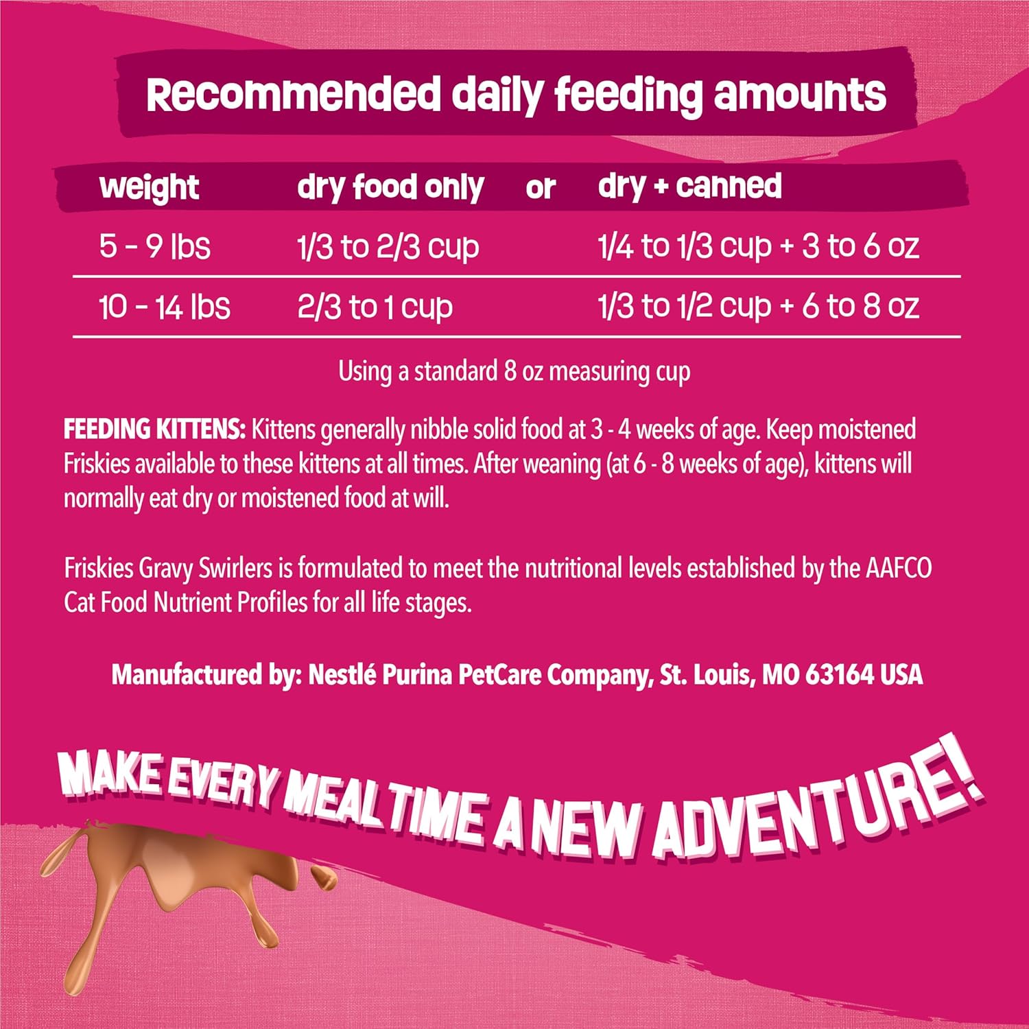 Bring the deliciousness of gravy mixed with two cat-favorite flavors to your cat’s dish with Purina Friskies Gravy Swirlers dry cat food. Savory chicken and salmon flavors combine to create the taste cats crave, and there’s gravy baked into each bite for added yum. Let the sound of the mouthwatering kibble hitting her bowl pique your cat’s attention, and watch as she delights in every last delicious bite. This Purina cat food recipe features essential vitamins and minerals for the everyday nutrition your cat needs to be her best self. Because it’s formulated for all life stages, this mouthwatering meal can follow your cat companion from her playful kitten days all the way through to her adventurous adult years. Give your cat the 100 percent complete and balanced nutrition she deserves along with the taste she adores every time you offer up a helping of this Purina cat food. Fill your cart with Purina Friskies Gravy Swirlers to be one step closer to filling her dish with a taste she loves.