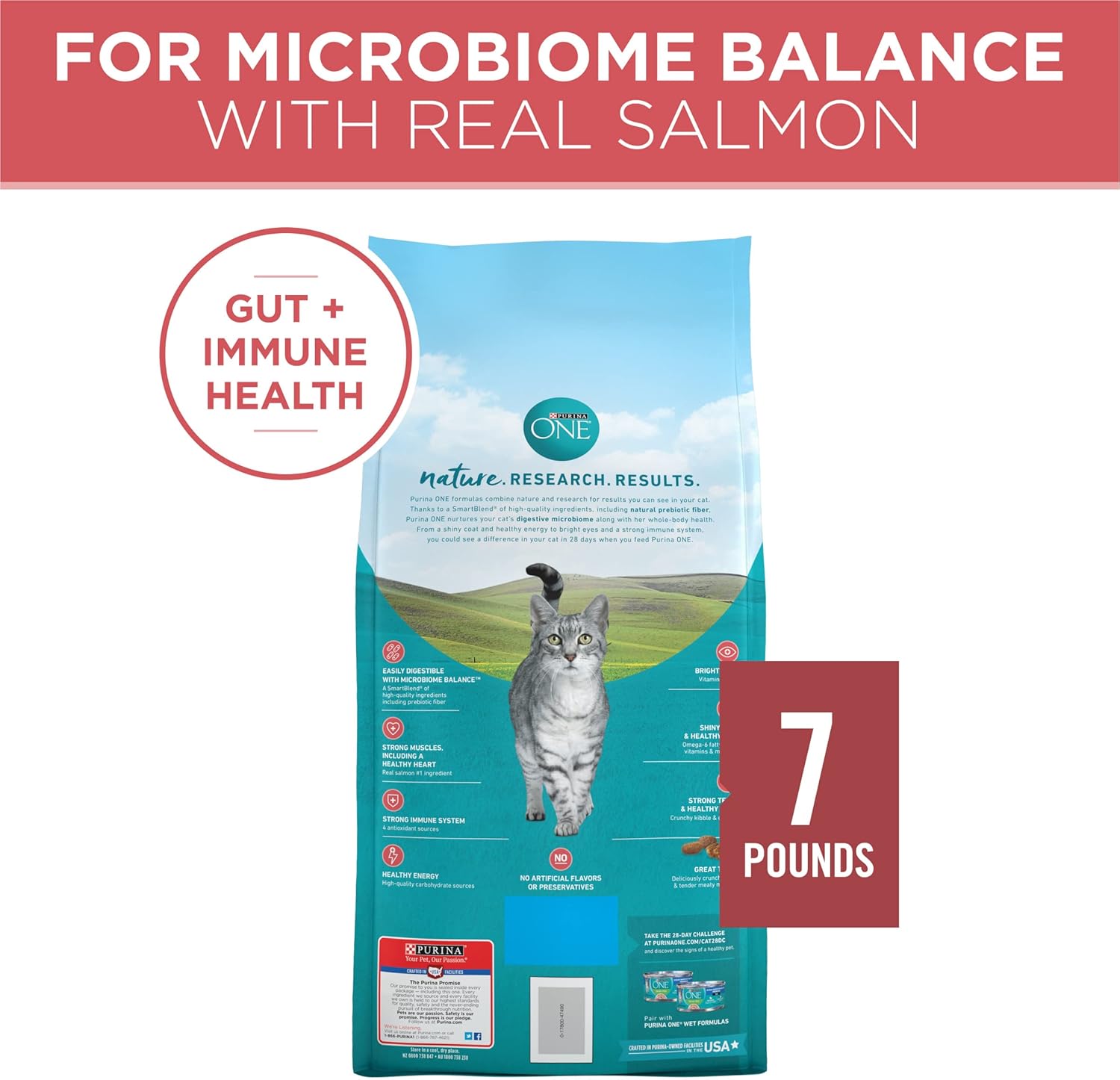 Serve your cat the crunchy bites and meaty morsels she loves with Purina ONE Tender Selects Blend With Real Salmon adult dry cat food. What are the ingredients in Purina ONE? We make this Purina One dry cat food salmon flavor with a Smart Blend of real ingredients, including accents of carrots and peas. Real salmon is the first ingredient, helping provide protein to support her strong muscles. Plus, this adult, natural cat food has added vitamins, minerals and nutrients for balanced nutrition. The digestive care cat food contains natural prebiotic fiber for gut health and immune support, and with added calcium, the crunchy cat food kibble helps maintain her strong teeth. All Purina ONE cat food ingredients serve a purpose, creating digestive health cat food with 0 percent fillers. Check the bag for the calories per serving, feeding chart and instructions on changing cat food, and take our 28 Day Challenge to see the difference Purina ONE Tender Selects salmon cat food can make.