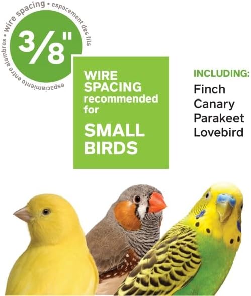 Prevue Pet Products Parakeet Manor small bird cage features a pull-out tray for easy cleaning and house-style roof line. These cages include two plastic cups, two plastic perches and are designed for parakeets, canaries and other small birds. Cage measures 12” long, 9” wide, and 16″ high with 3/8″ wire spacing.