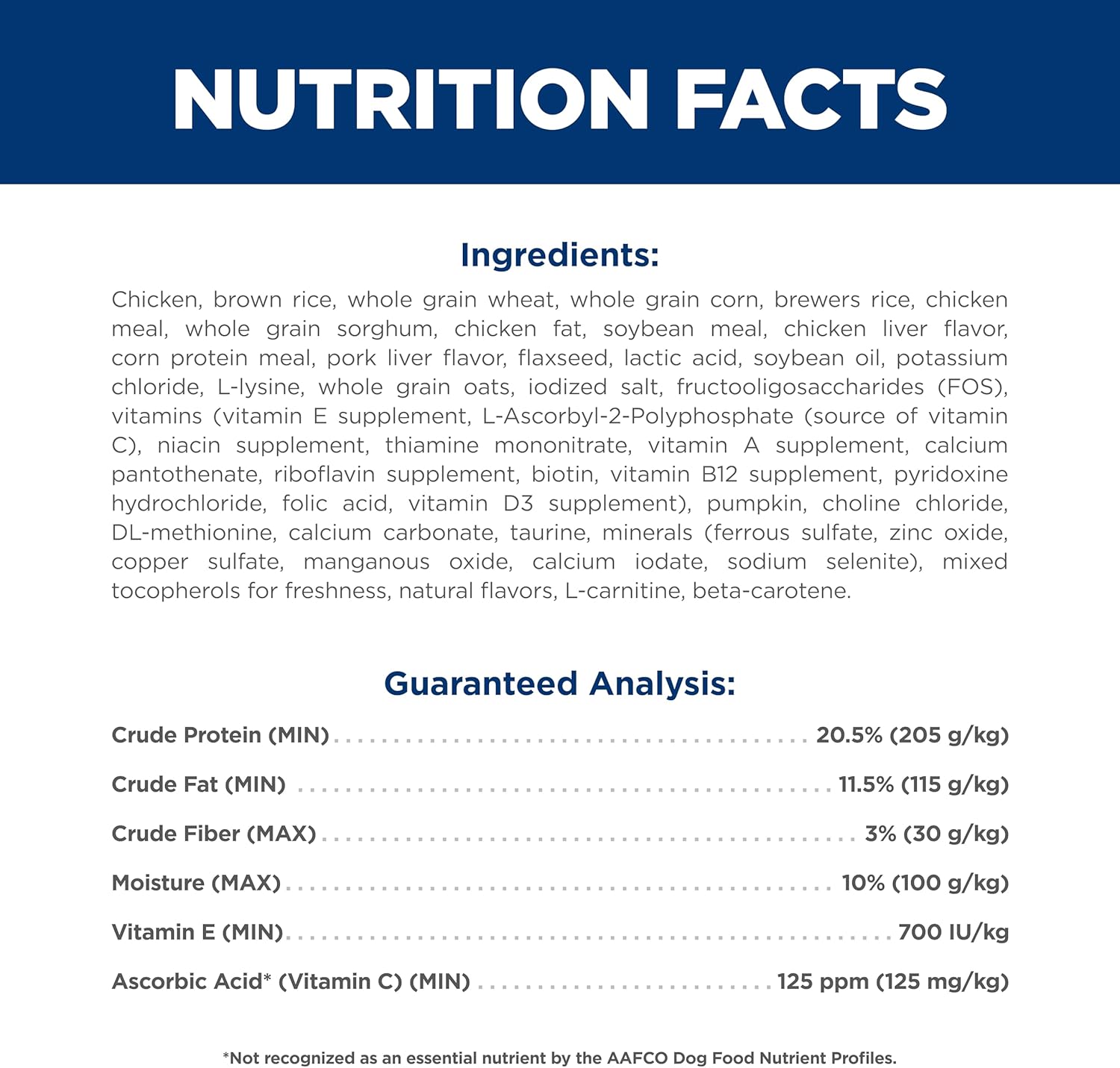 Your little dog is still a full-grown canine, so make sure your small or mini breed dog has the precise nutrition of Hill’s Science Diet Small & Mini adult dog food. This small dog dog food is made with easy-to-digest ingredients, including pumpkin, to help support healthy digestive and stool quality. The right combination of protein, fats, and carbs gives your small dog the energy they need, with balanced nutrition to help keep them at their ideal body weight. To support your small or mini dog’s immune system, this dog food made with natural ingredients contains a proprietary antioxidant blend that will promote lifelong health for your adult small breed dog. All of this in a delightful kibble texture designed for a small dog’s unique preferences! 4.5 pound bag