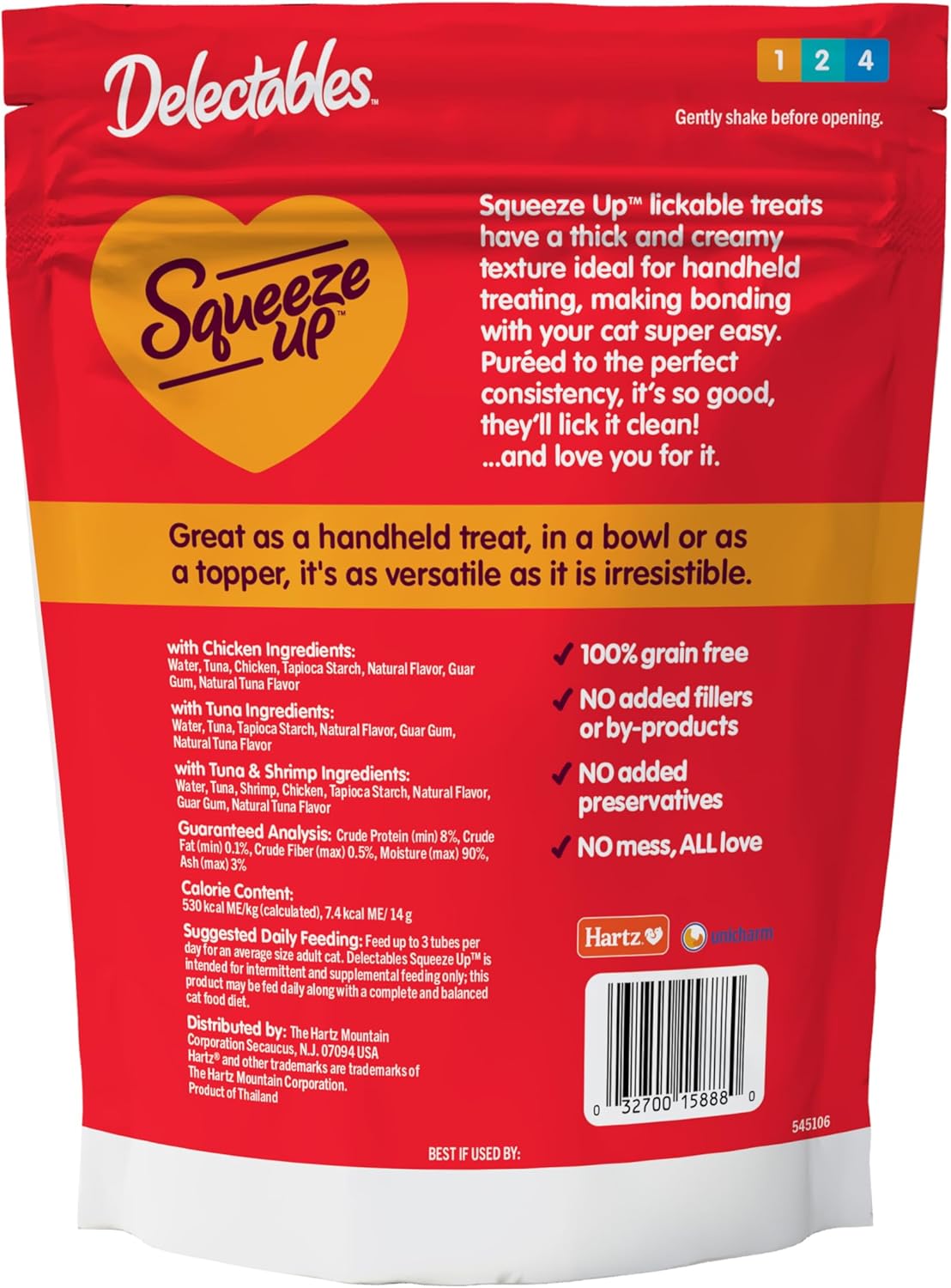 Hartz Delectables Squeeze Up treats are handheld lickable cat treats that will transform treat time to a fun and loving bonding experience between you and your cat! Squeezable cat treats have a thick and creamy puree texture and come in easy-to-use, no-mess tubes. These lickable cat treats are great as a handheld treat, in a bowl, or as a cat food topper. The enticing flavors are so delicious, your cat will paw for more. Squeeze Up treats are 100% grain-free, without any added fillers, by-products, or preservatives, so you’re giving your cat the best… and they’ll love you for it. Deliciously De-Lick-able Delectables! 24 pack